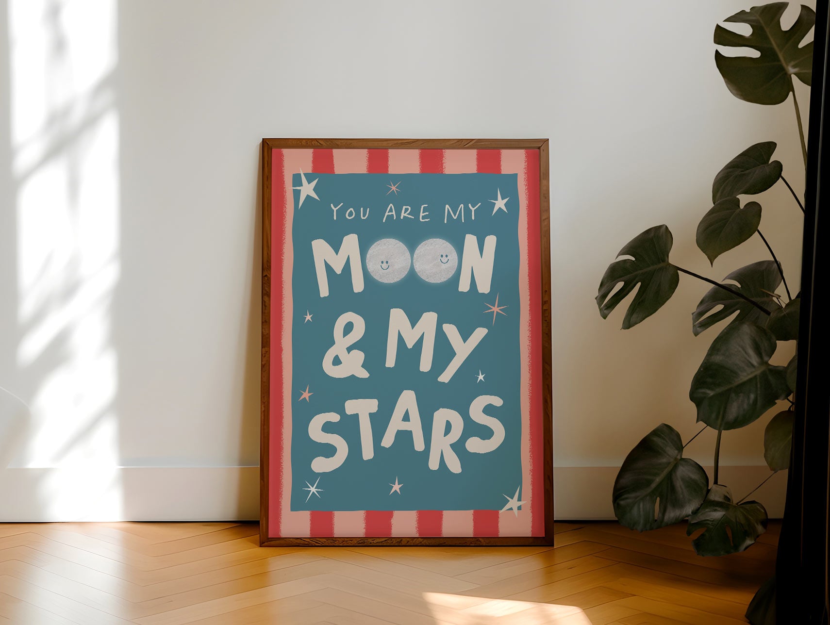 Brighten up your child's nursery or bedroom with this cute typographic and illustrative  Moon And My Stars print.