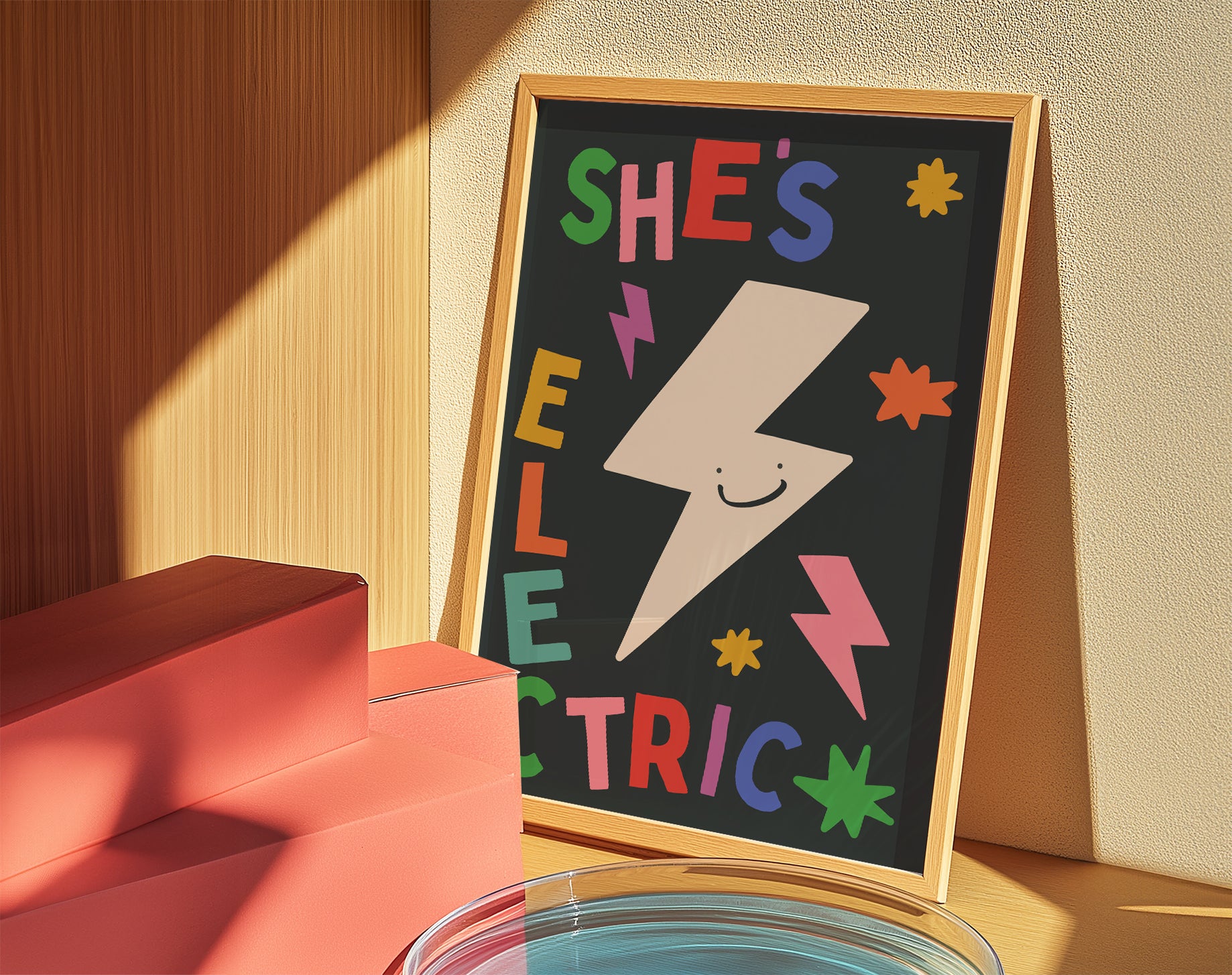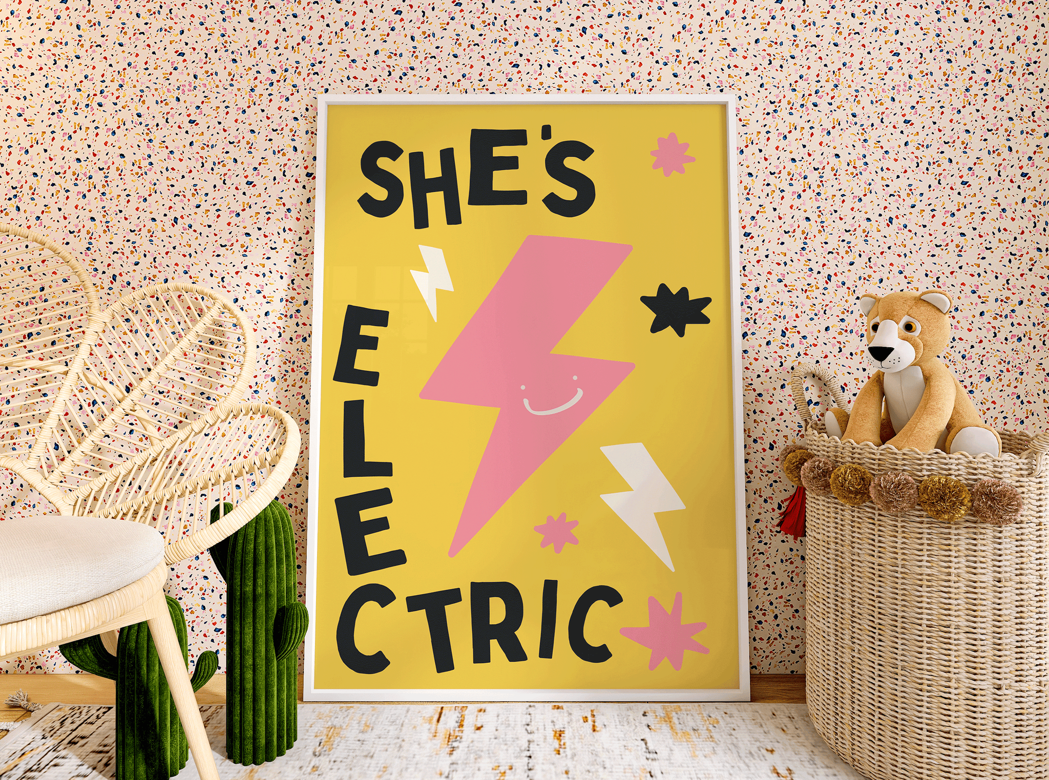 Brighten up your child's nursery or bedroom with this illustrated She's Electric print.