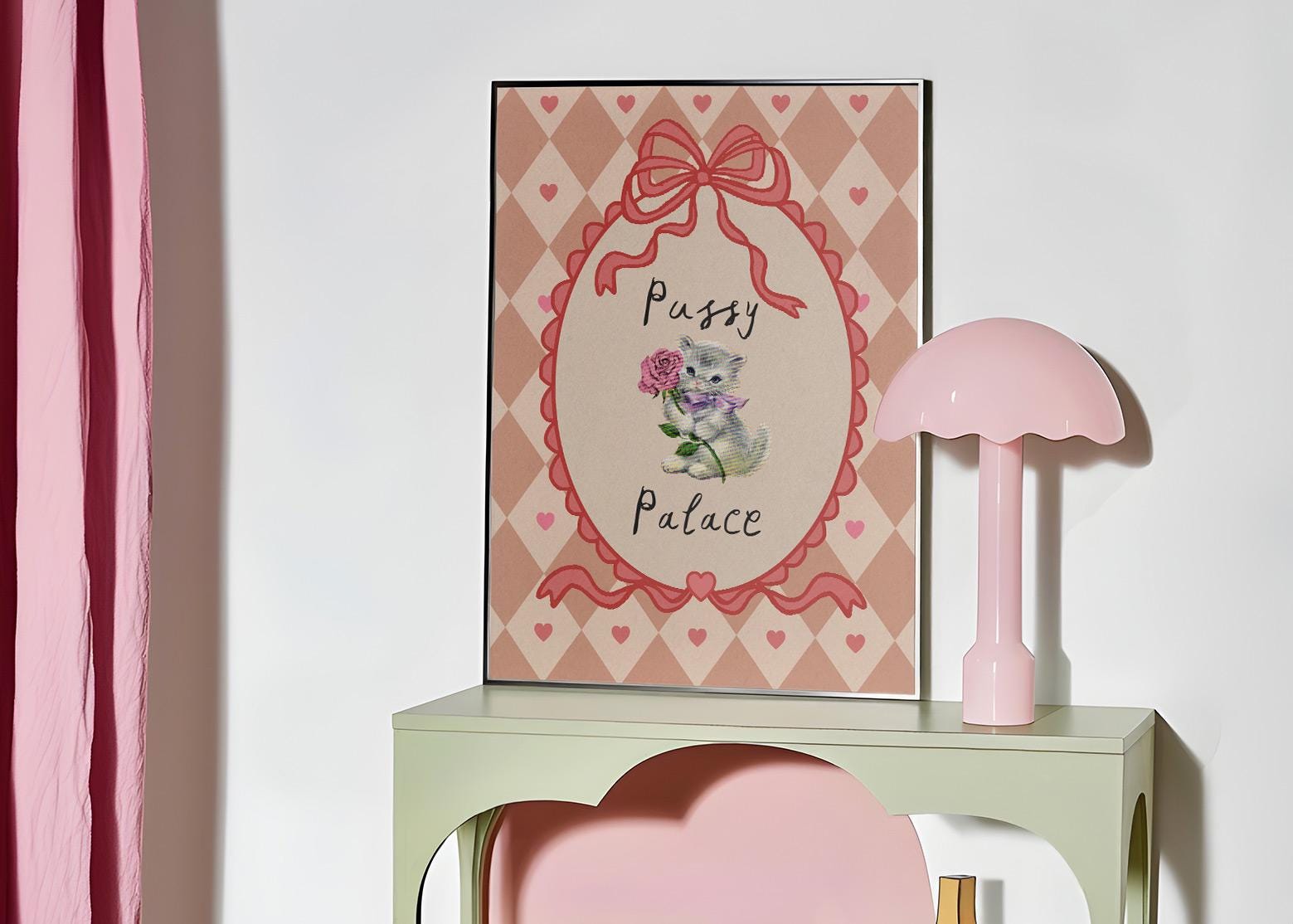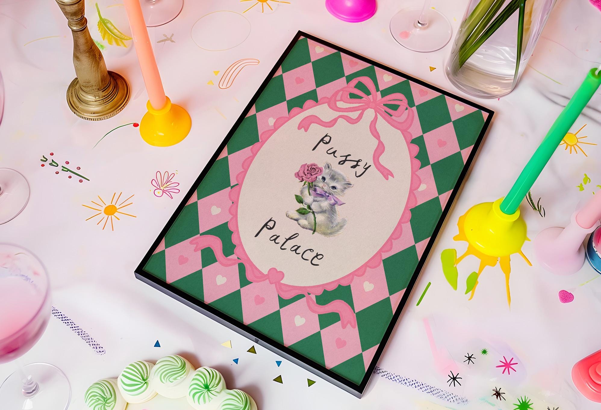 Pussy Palace print, featuring a bright and bold harlequin print pattern and cute cat image, perfect for your gal pad!